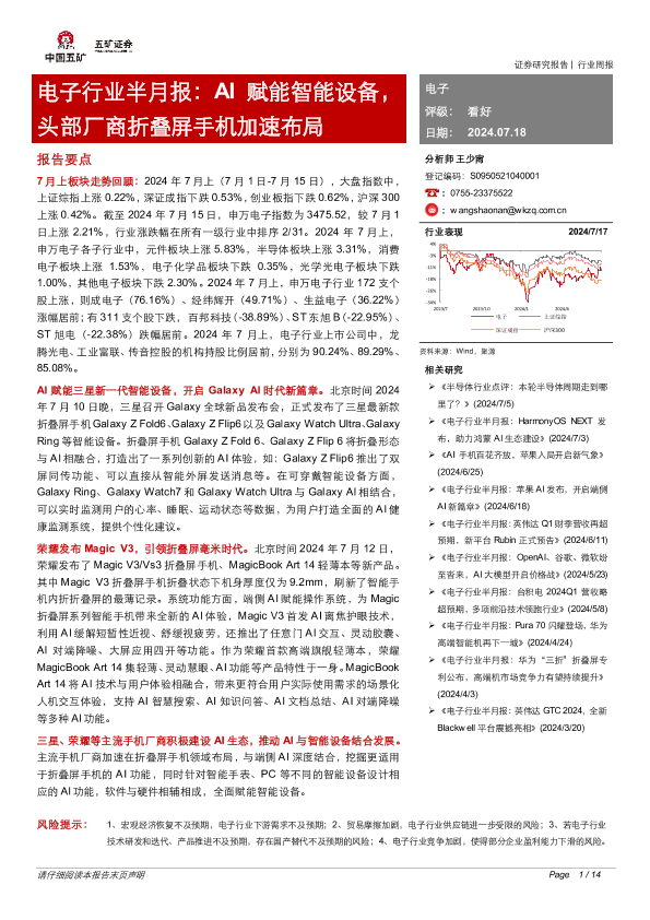 【五矿证券】【20240718】电子行业半月报:AI赋能智能设备,头部厂商折叠屏手机加速布局-14页