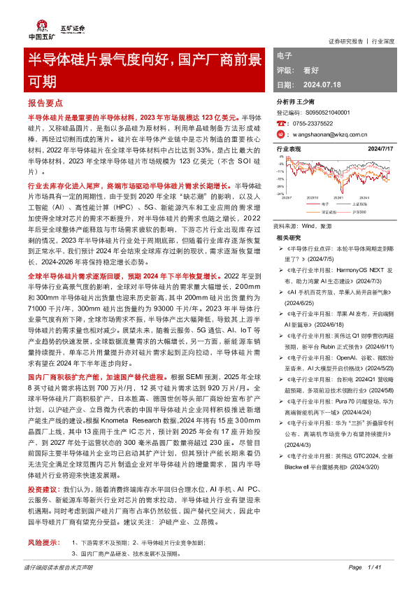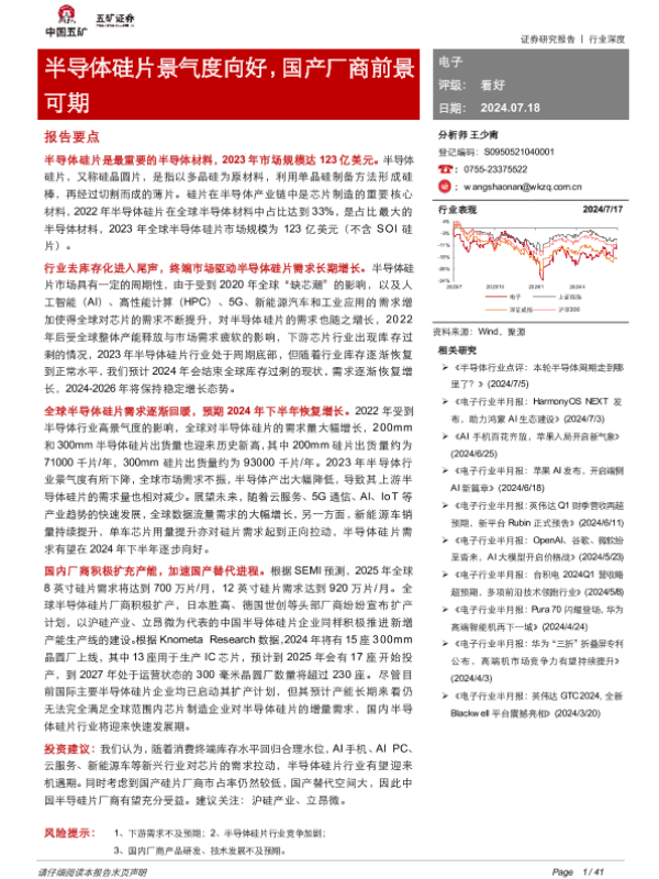 【五矿证券】【20240718】电子行业:半导体硅片景气度向好,国产厂商前景可期-41页