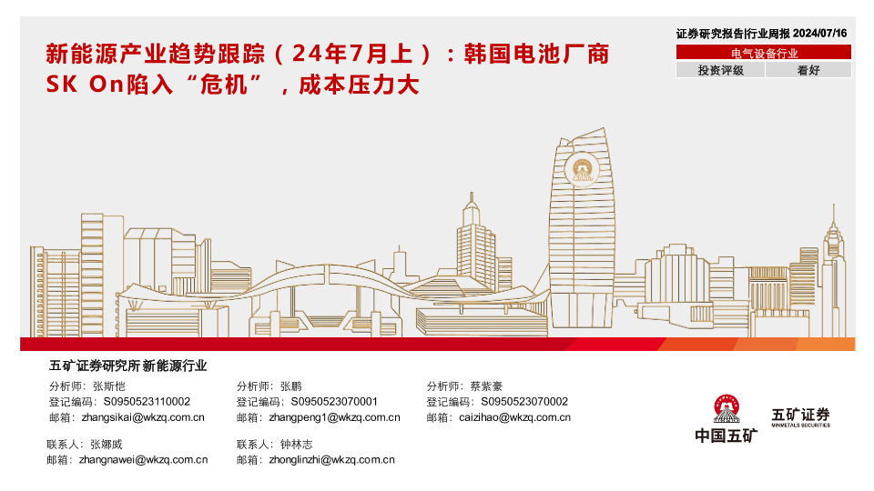 【五矿证券】【20240716】电气设备行业新能源产业趋势跟踪(24年7月上):韩国电池厂商SK On陷入“危机”,成本压力大-47页
