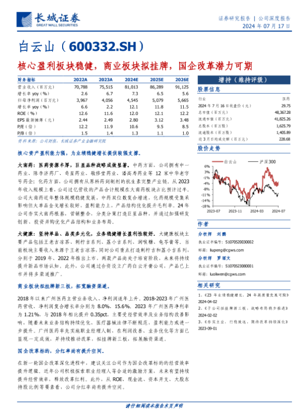 【长城证券】【20240717】白云山(600332)核心盈利板块稳健,商业板块拟挂牌,国企改革潜力可期-15页
