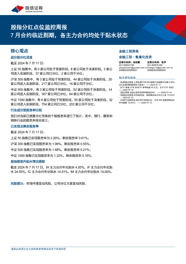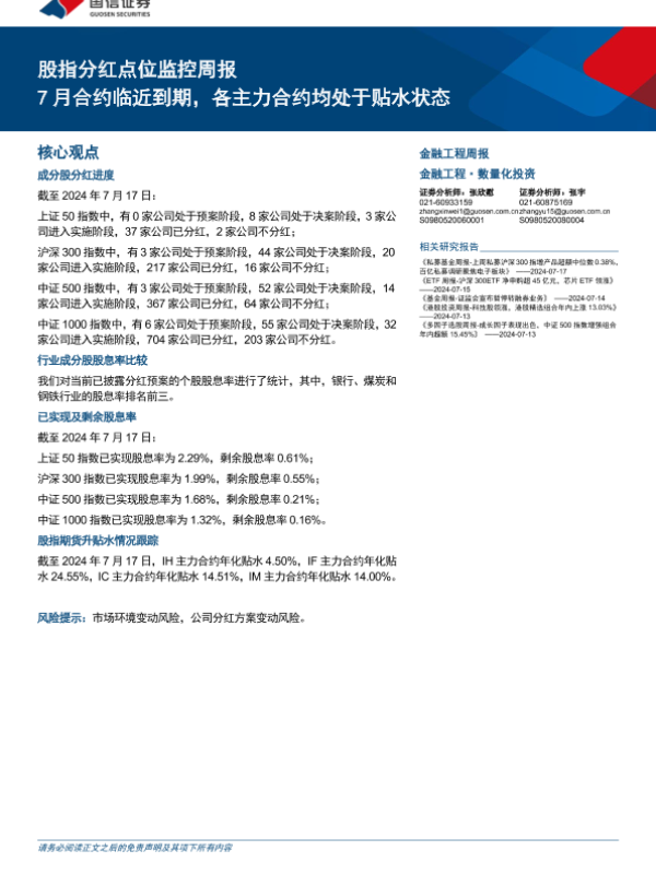 【国信证券】【20240717】股指分红点位监控:7月合约临近到期,各主力合约均处于贴水状态-16页