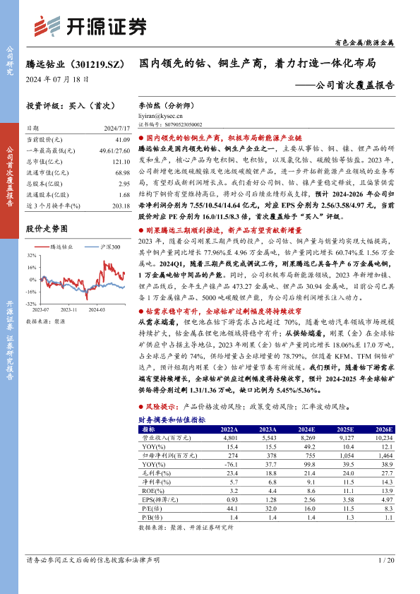 【开源证券】【20240718】腾远钴业(301219)公司首次覆盖报告:国内领先的钴、铜生产商,着力打造一体化布局-20页