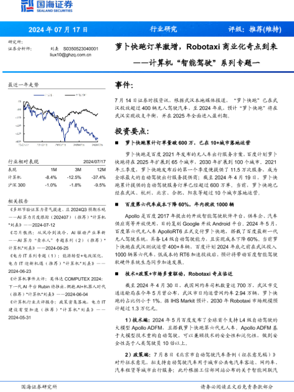 【国海证券】【20240717】计算机行业“智能驾驶”系列专题一:萝卜快跑订单激增,Robotaxi商业化奇点到来-17页