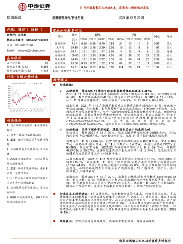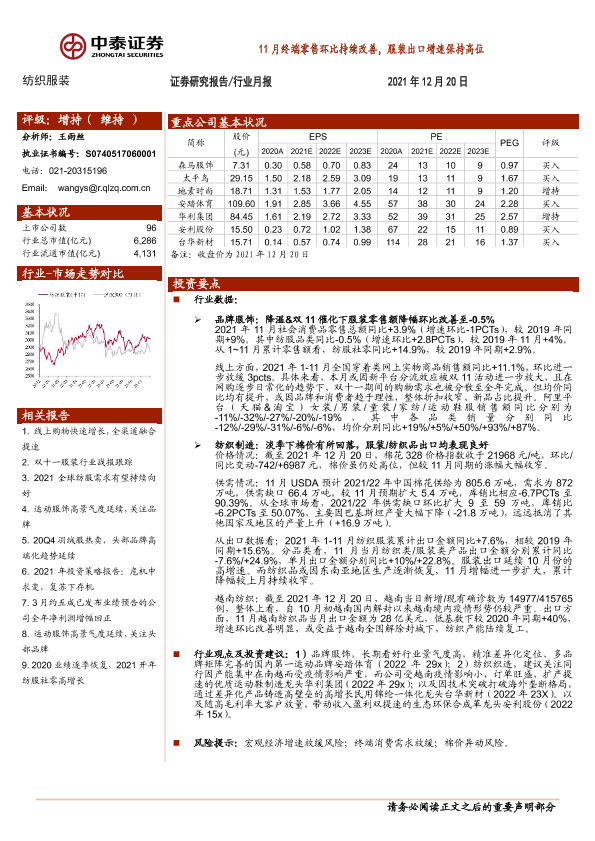 【中泰证券】【20211220】纺织服装行业月报:11月终端零售环比持续改善,服装出口增速保持高位-18页