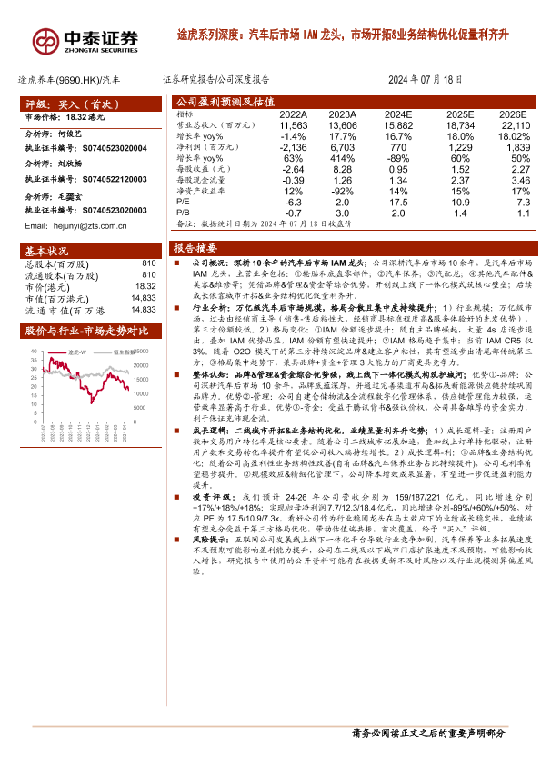 【中泰证券】【20240718】途虎养车(9690.HK)途虎系列深度,汽车后市场IAM龙头,市场开拓&业务结构优化促量利齐升-21页