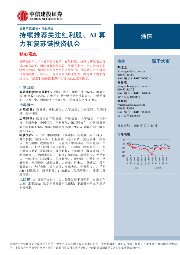 【中信建投证券】【20240715】通信行业:持续推荐关注红利股、AI算力和复苏链投资机会-13页