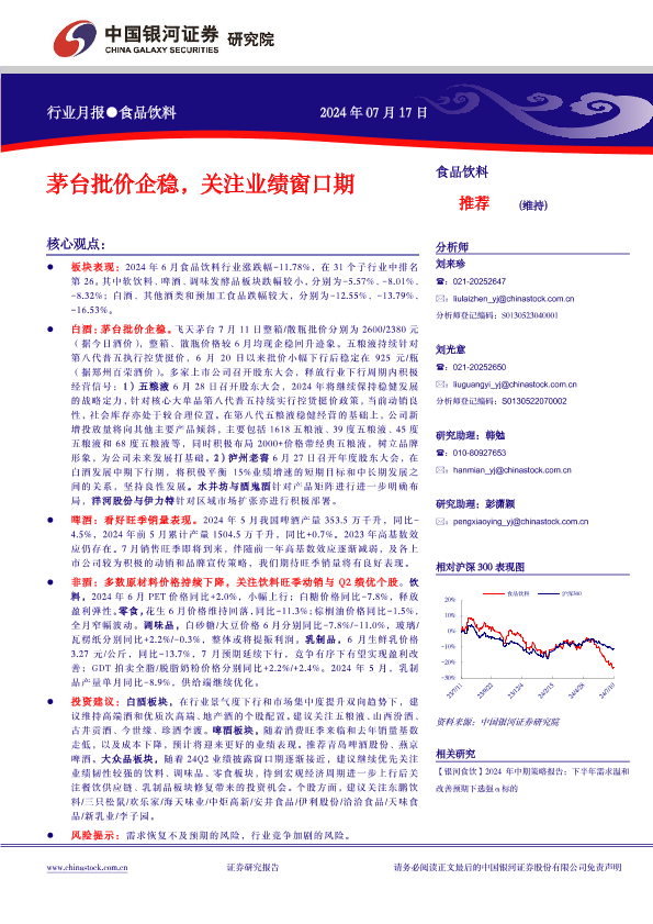 【银河证券】【20240717】食品饮料行业月报:茅台批价企稳,关注业绩窗口期-13页