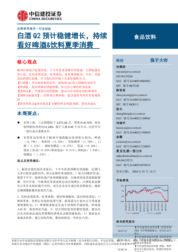 【中信建投证券】【20240714】食品饮料行业动态:白酒Q2预计稳健增长,持续看好啤酒&饮料夏季消费-31页