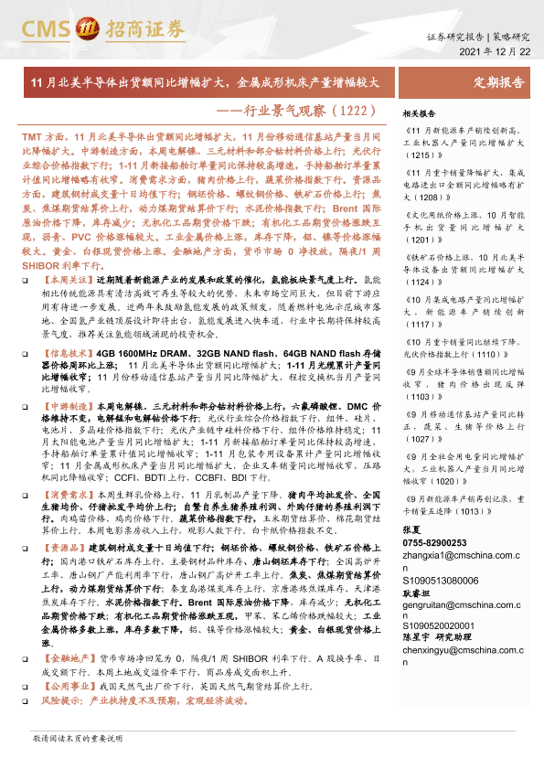 【海通证券】【20211222】行业景气观察:11月北美半导体出货额同比增幅扩大,金属成形机床产量增幅较大-34页