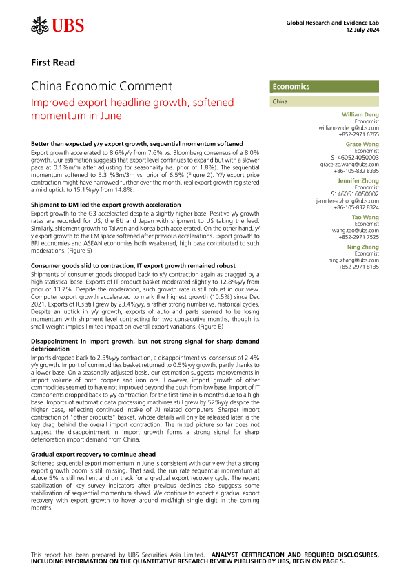【UBS Securities Asia Limited】【20240712】China Economic Comment Improved export headline growth, softened momentum in June-8页