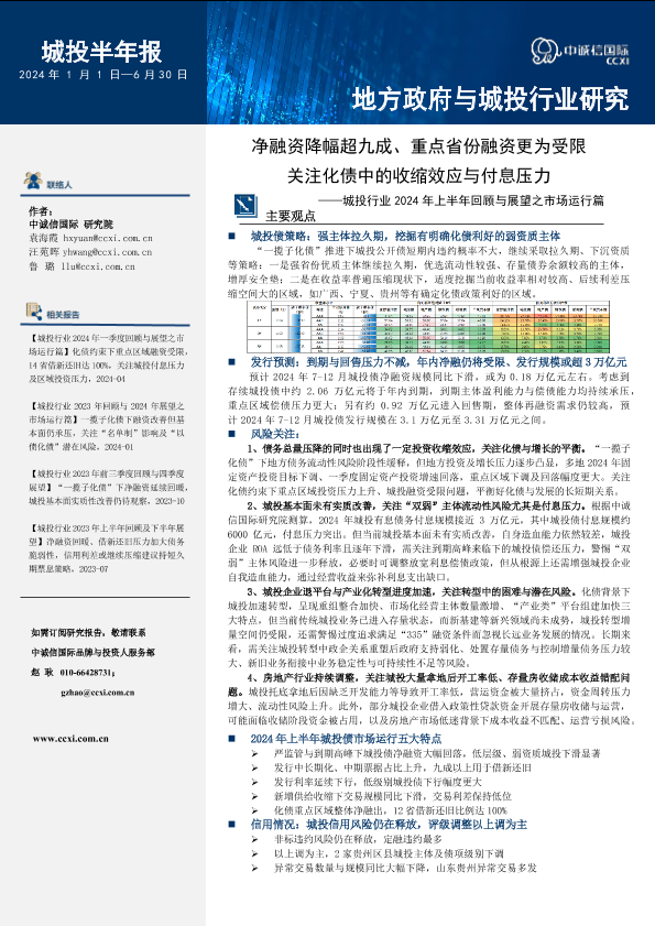 【中诚信国际】【20240101】净融资降幅超九成、重点省份融资更为受限,关注化债中的收缩效应与付息压力——城投行业2024年上半年回顾与展望之市场运行篇-20页