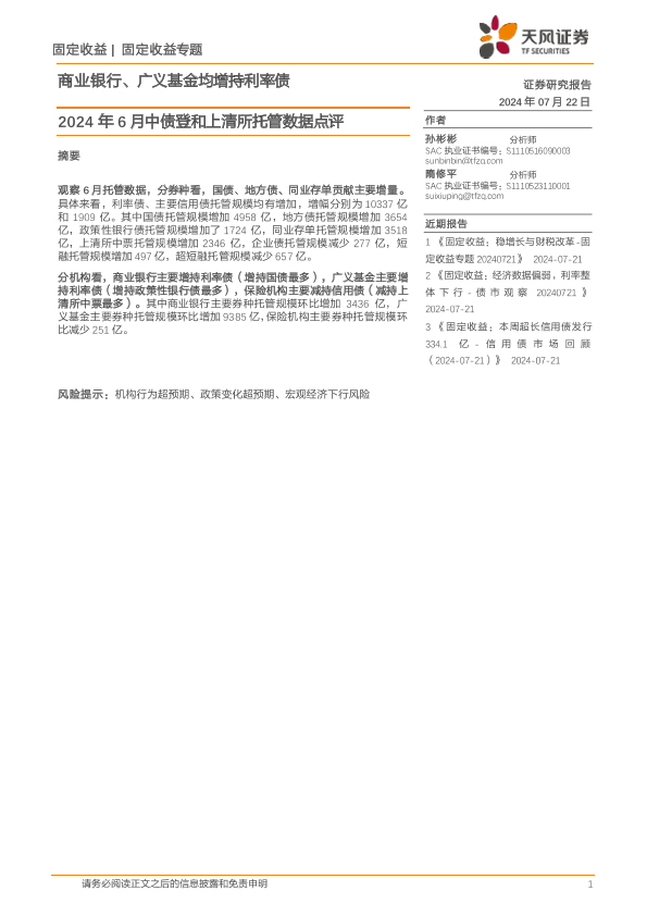 【天风证券】【20240722】2024年6月中债登和上清所托管数据点评:商业银行、广义基金均增持利率债-11页