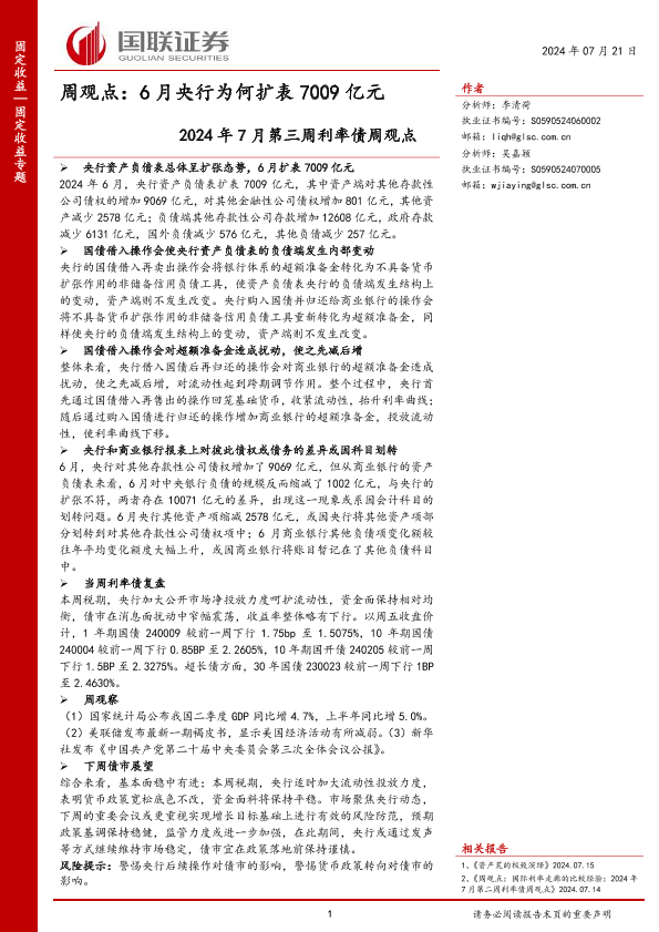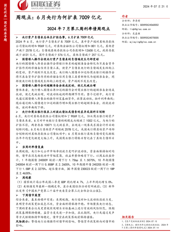 【国联证券】【20240721】2024年7月利率债观点:6月央行为何扩表7009亿元-19页