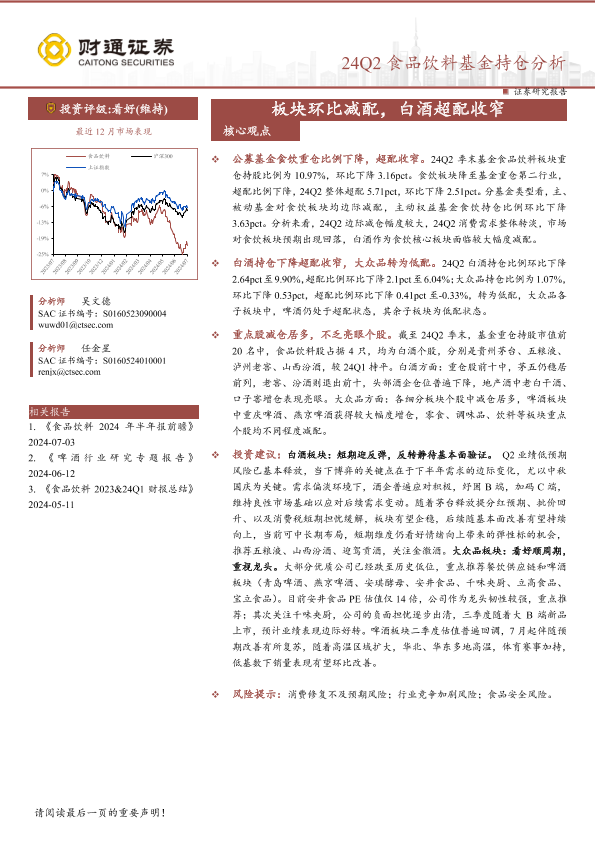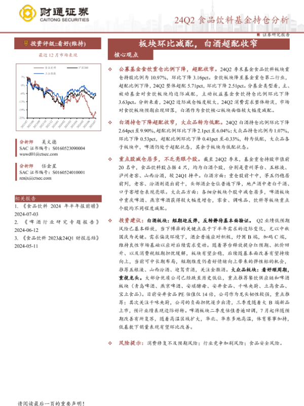 【财通证券】【20240722】24Q2食品饮料行业基金持仓分析:板块环比减配,白酒超配收窄-11页