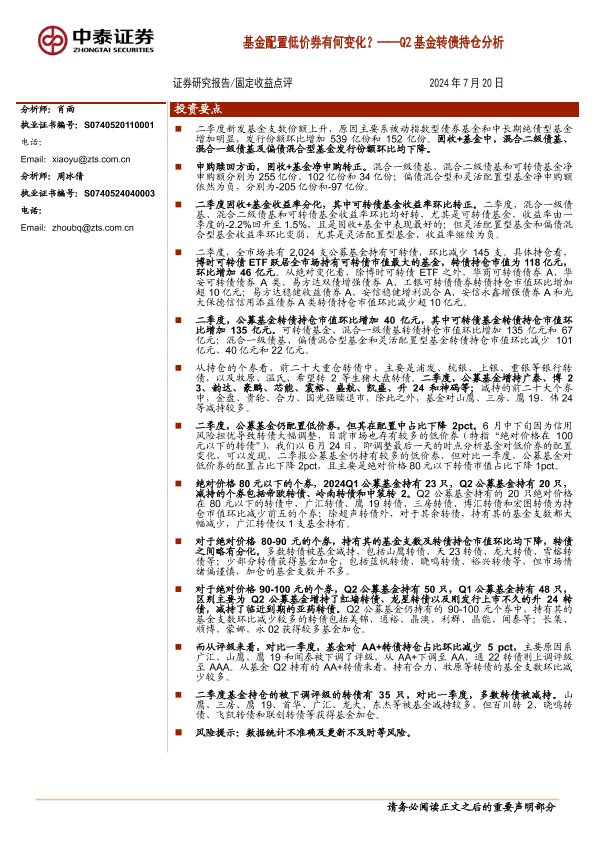 【中泰证券】【20240720】Q2基金转债持仓分析:基金配置低价券有何变化?-16页