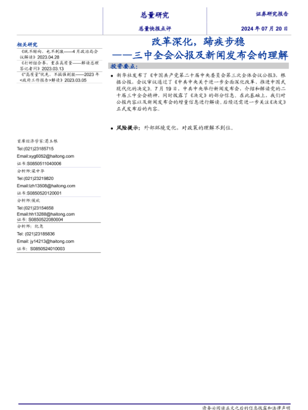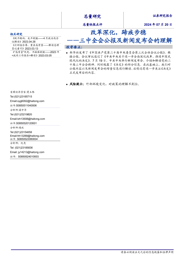 【海通证券】【20240720】三中全会公报及新闻发布会的理解:改革深化,蹄疾步稳-10页
