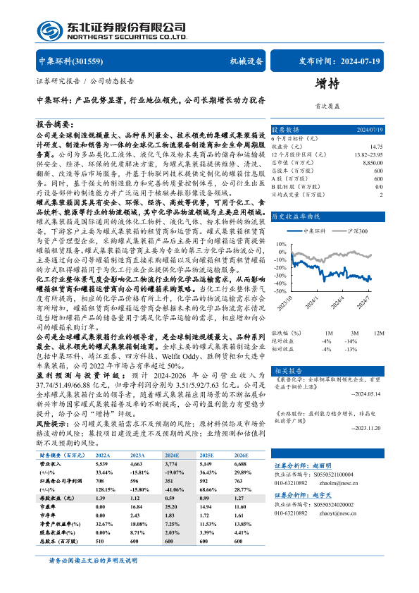 中集环科 机械设备 罐式集装箱 行业分析 财务预测