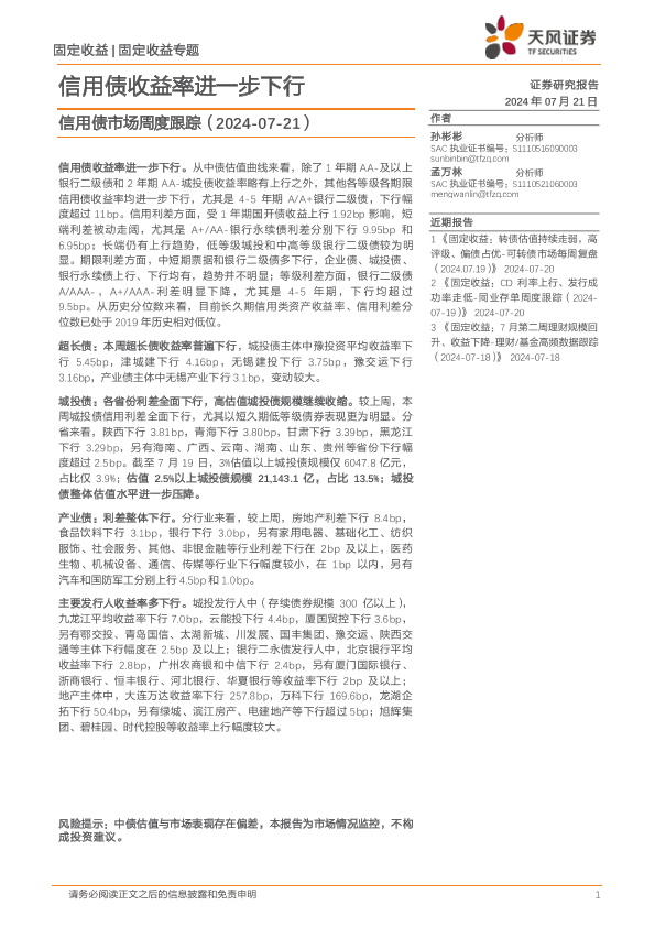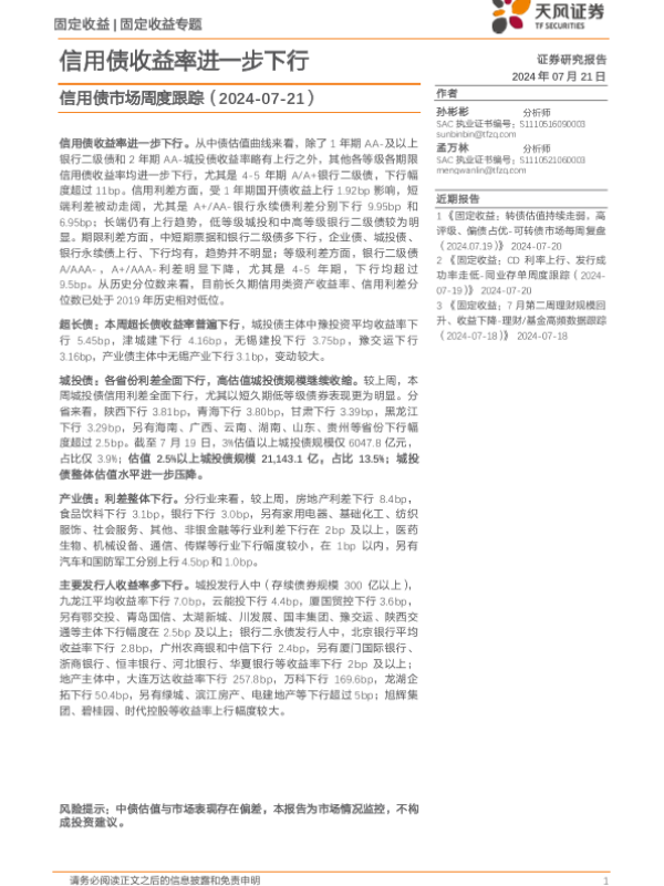 【天风证券】【20240721】信用债市场跟踪:信用债收益率进一步下行-16页