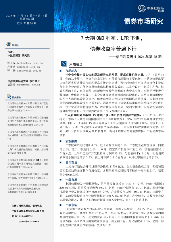 【中诚信国际】【20240725】信用利差2024年第28期:7天期OMO利率、LPR下调,债券收益率普遍下行-15页