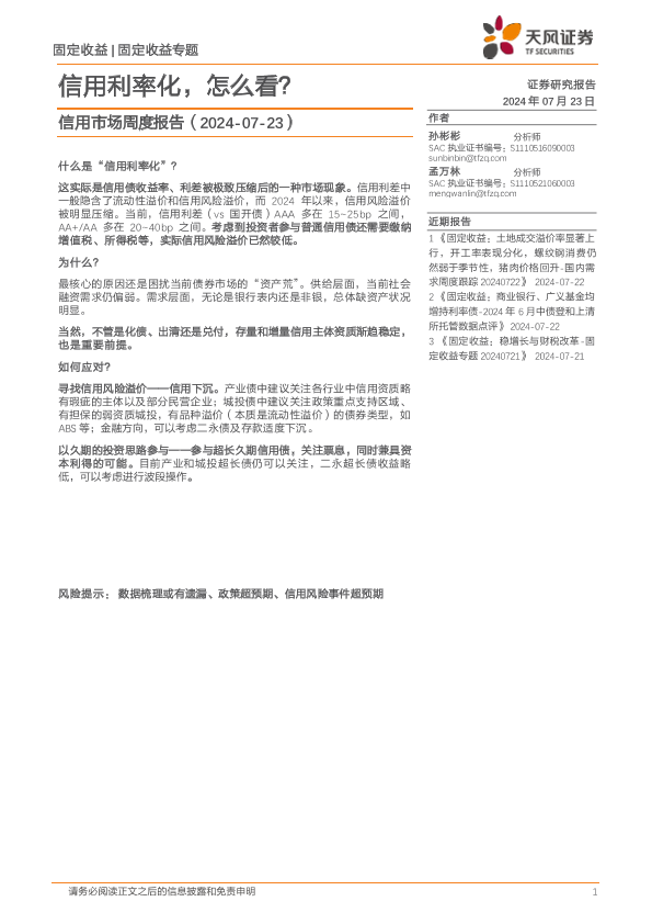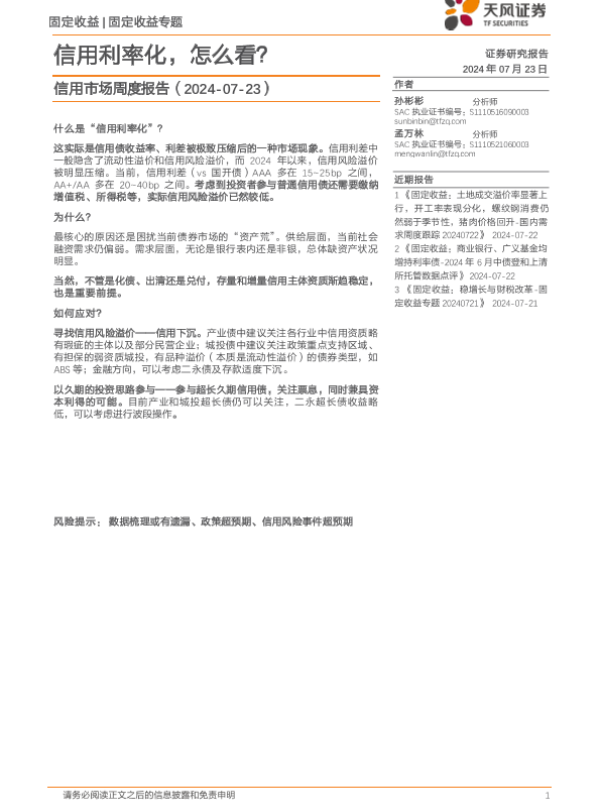 【天风证券】【20240723】信用市场报告:信用利率化,怎么看?-12页
