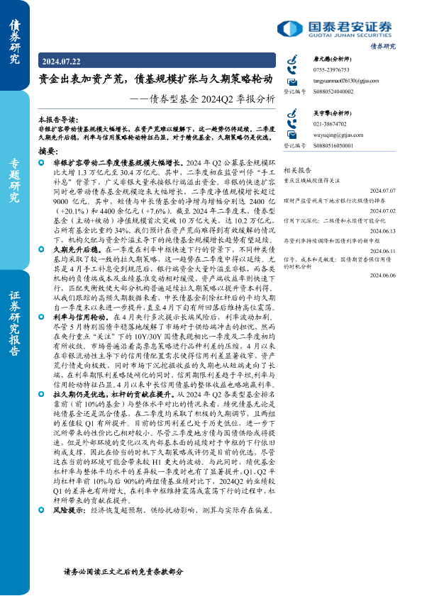 【国泰君安证券】【20240722】债券型基金2024Q2季报分析:资金出表加资产荒,债基规模扩张与久期策略轮动-14页