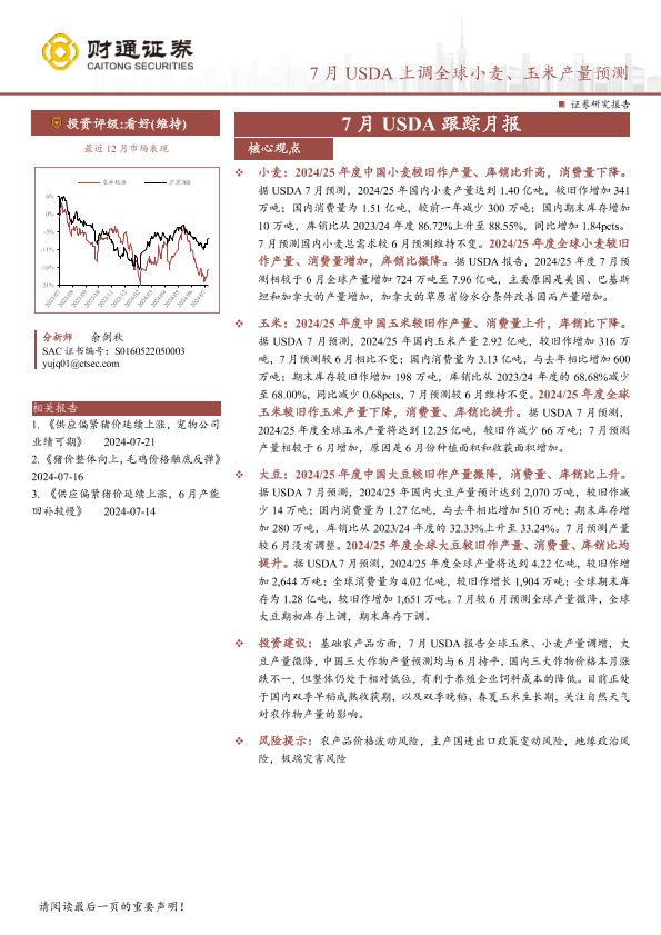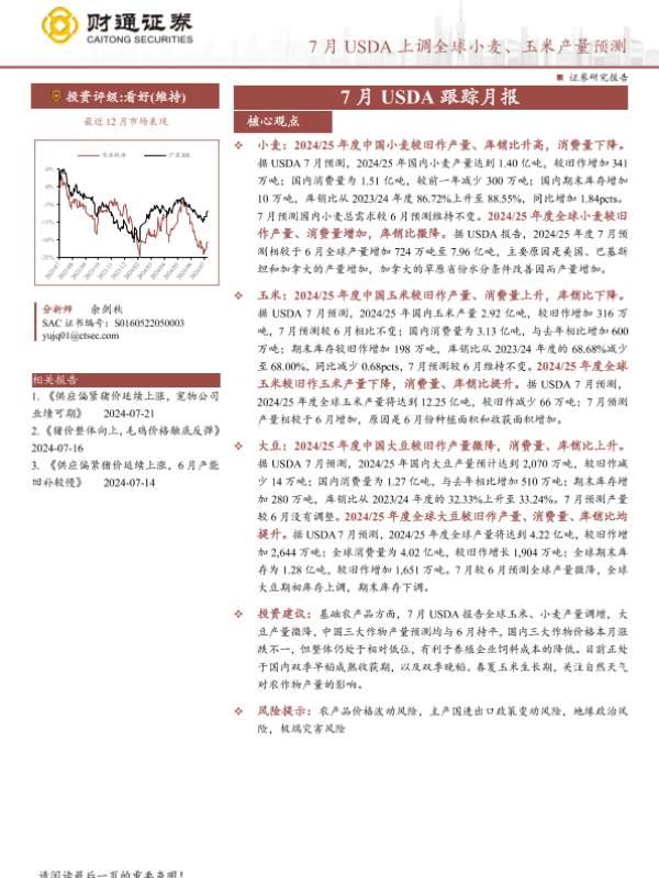 【财通证券】【20240722】农林牧渔行业7月USDA跟踪月报:7月USDA上调全球小麦、玉米产量预测-13页