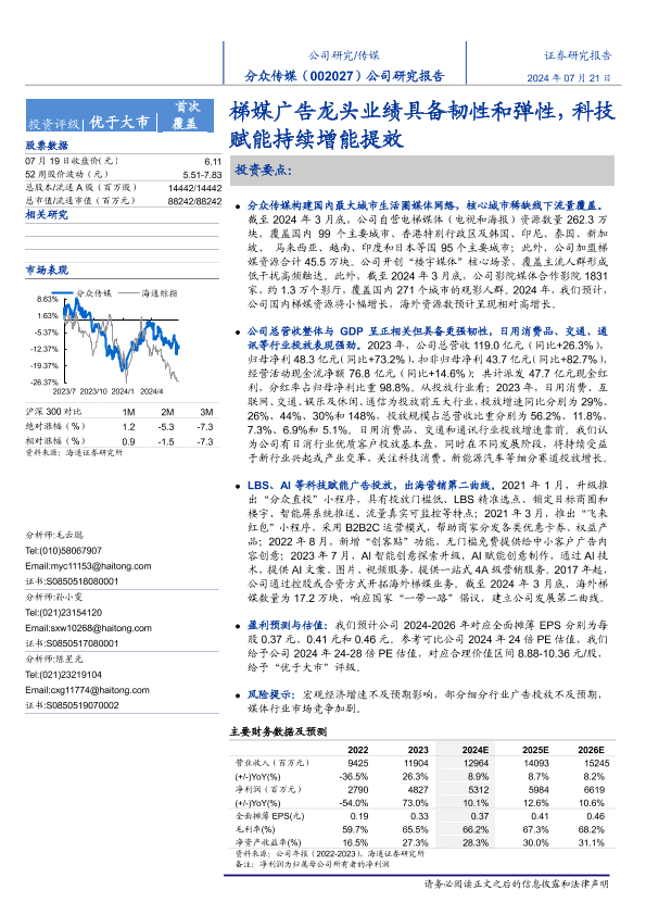 【海通证券】【20240721】分众传媒(002027)公司研究报告:梯媒广告龙头业绩具备韧性和弹性,科技赋能持续增能提效-20页