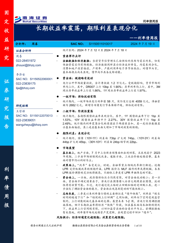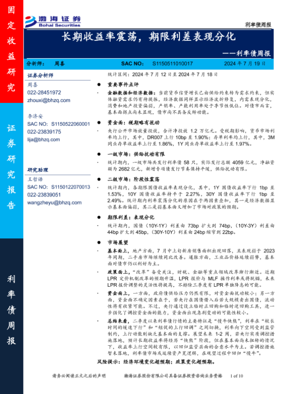 【渤海证券】【20240719】利率债:长期收益率震荡,期限利差表现分化-10页