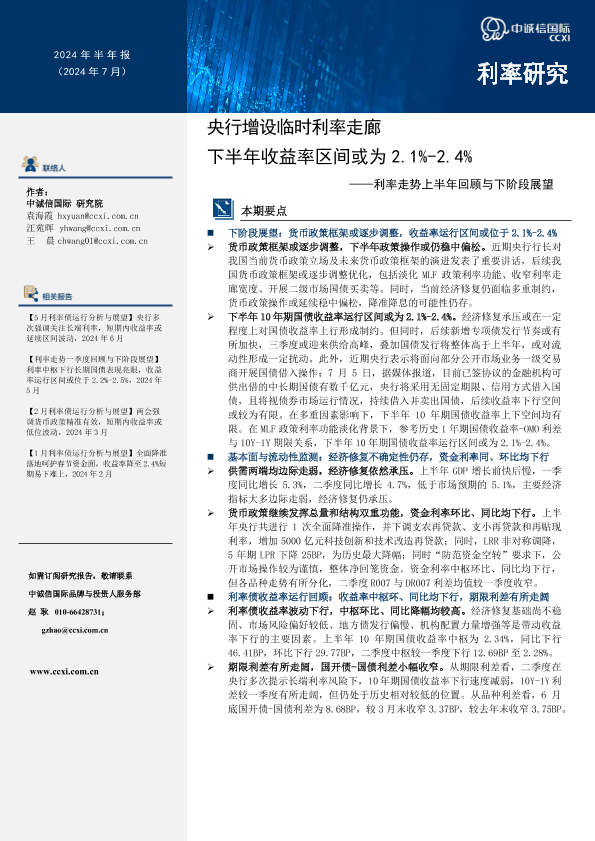 【中诚信国际】【20240723】利率走势上半年回顾与下阶段展望:央行增设临时利率走廊,下半年收益率区间或为2.1%-2.4%-13页