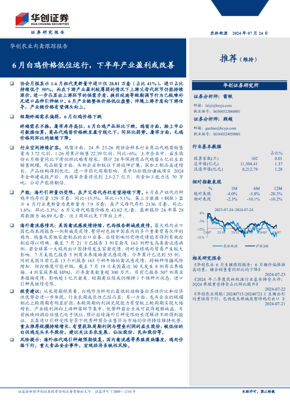 【华创证券】【20240724】华创农业行业肉禽跟踪报告:6月白鸡价格低位运行,下半年产业盈利或改善-13页