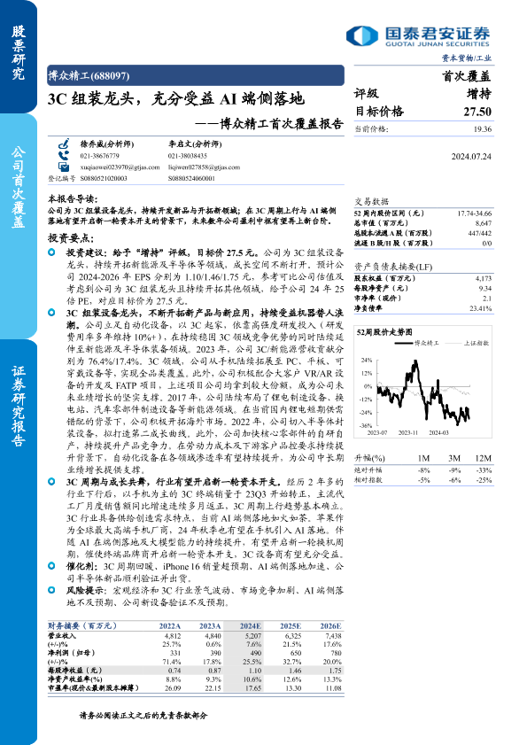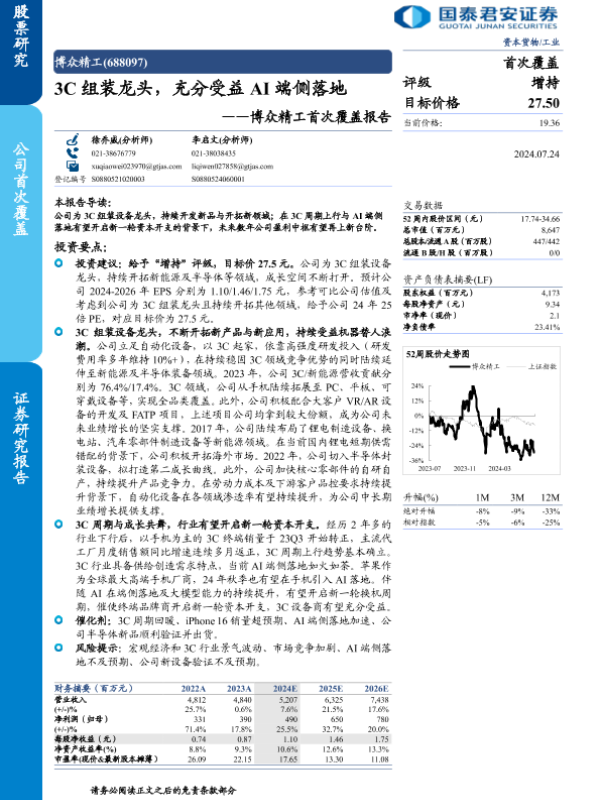 【国泰君安证券】【20240724】博众精工(688097)首次覆盖报告:3C组装龙头,充分受益AI端侧落地-37页