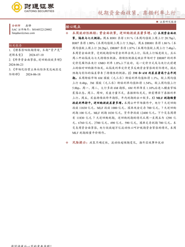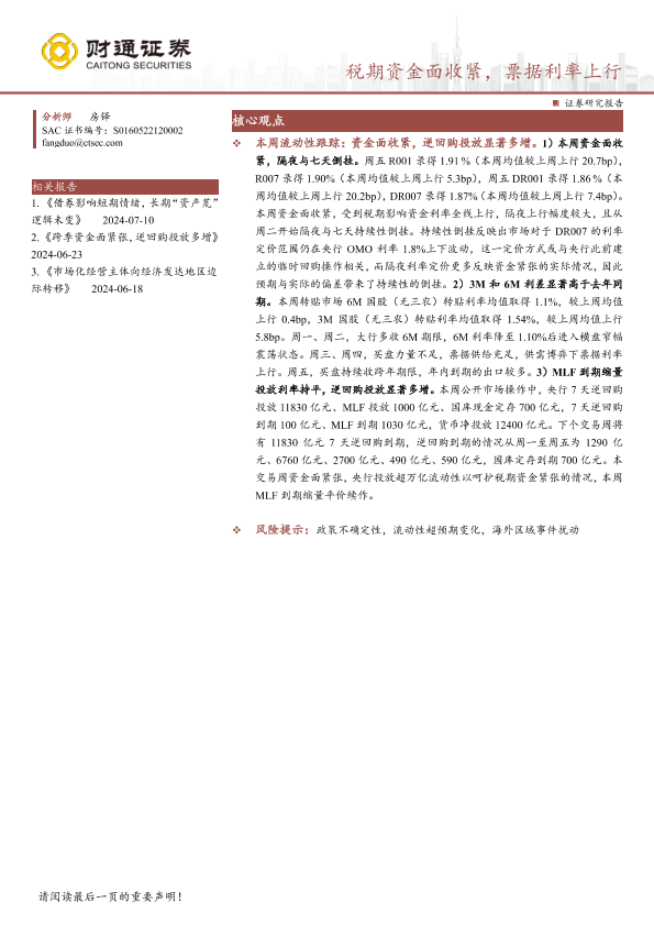 【财通证券】【20240721】税期资金面收紧,票据利率上行-11页