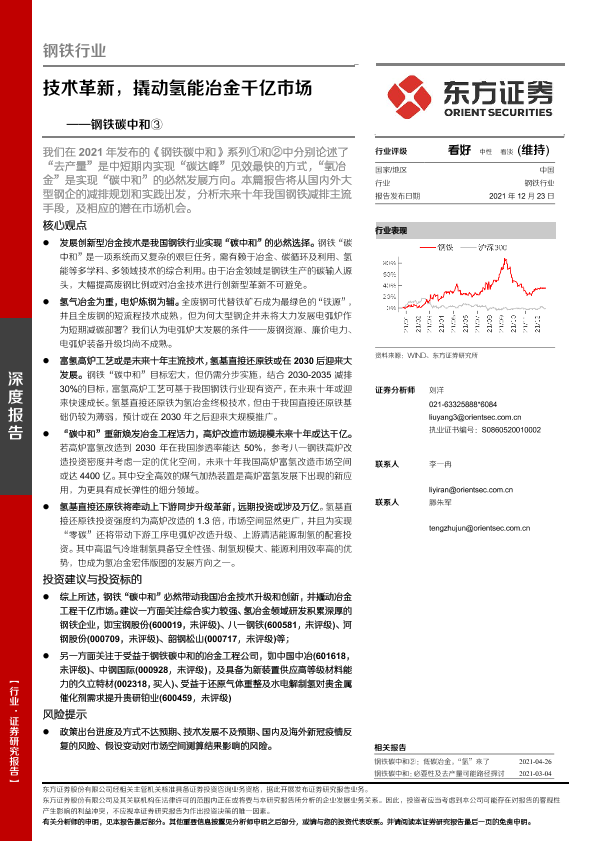 【东方证券】【20211223】钢铁行业钢铁碳中和③:技术革新,撬动氢能冶金千亿市场-22页