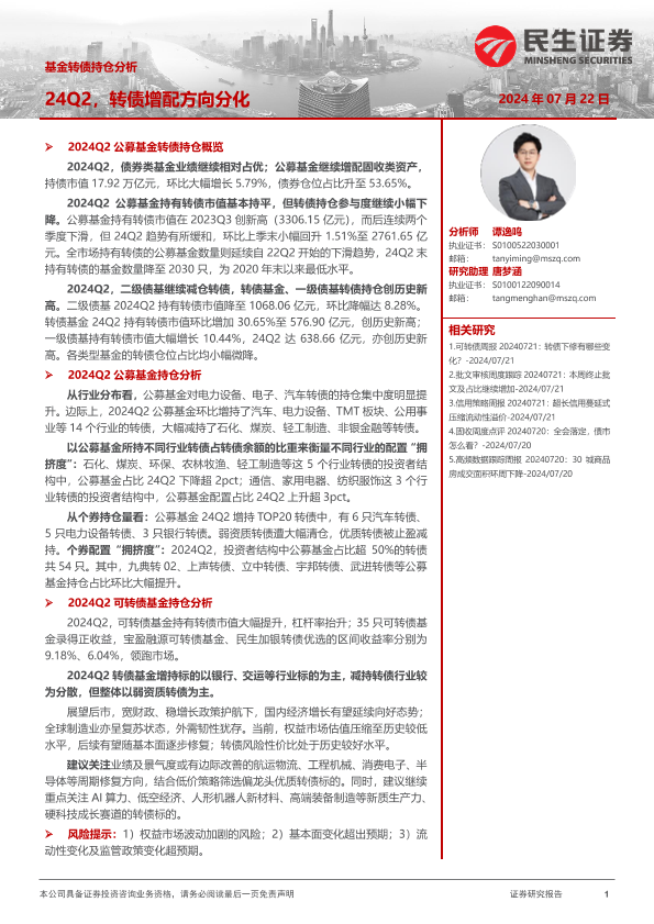 【民生证券】【20240722】基金转债持仓分析:24Q2,转债增配方向分化-20页
