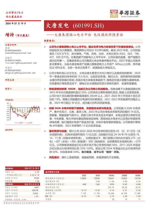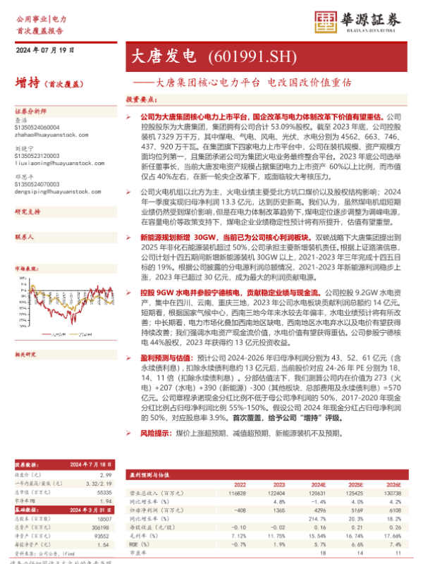 【华源证券】【20240719】大唐发电(601991)大唐集团核心电力平台,电改国改价值重估-16页