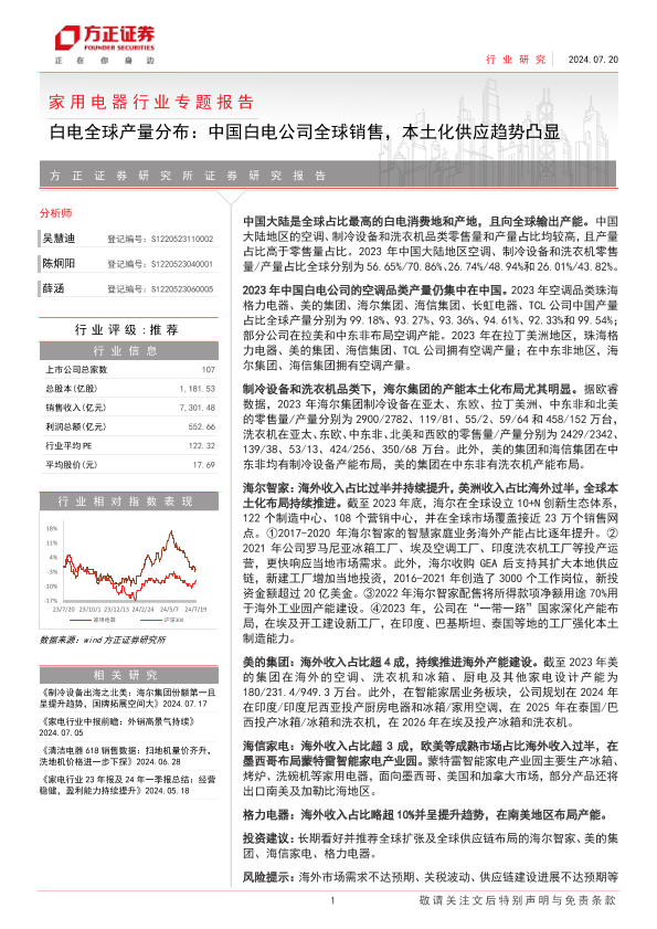 【方正证券】【20240720】家用电器行业专题报告-白电全球产量分布:中国白电公司全球销售,本土化供应趋势凸显-10页