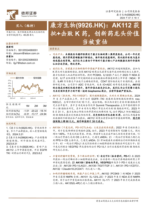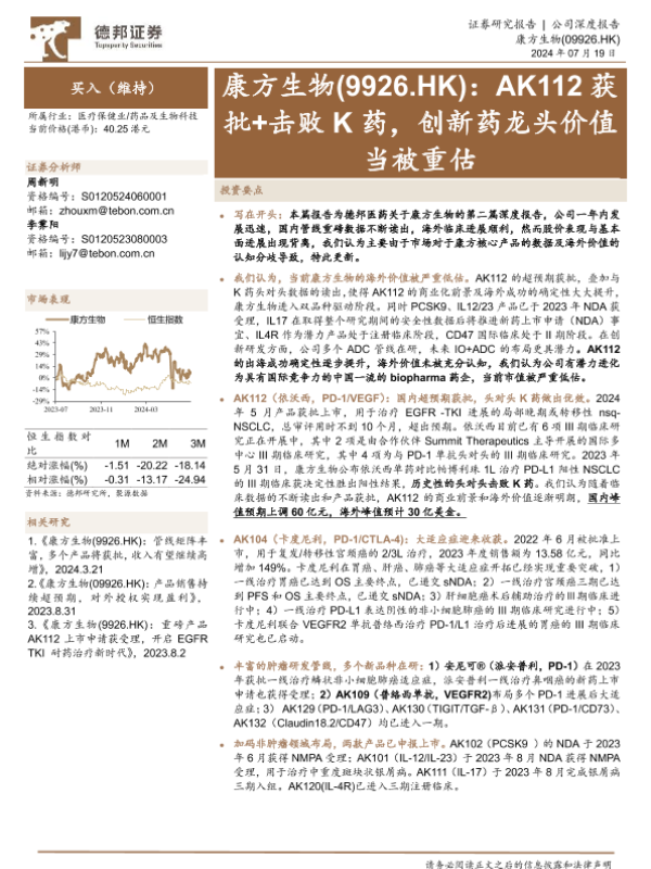 【德邦证券】【20240719】康方生物(09926.HK)AK112获批+击败K药,创新药龙头价值当被重估-38页