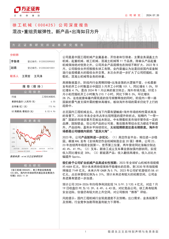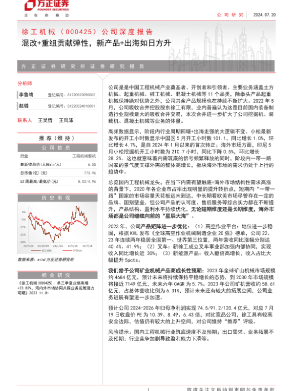 【方正证券】【20240720】徐工机械(000425)公司深度报告:混改+重组贡献弹性,新产品+出海如日方升-30页