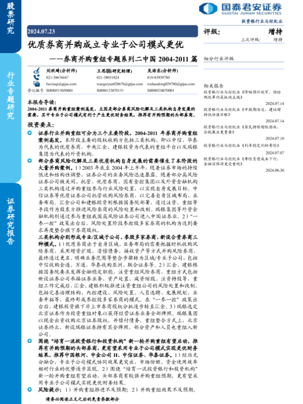 【国泰君安证券】【20240723】投资银行业与经纪业行业券商并购重组专题系列二中国2004-2011篇:优质券商并购成立专业子公司模式更优-18页