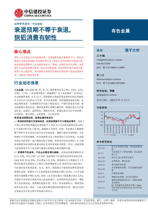 【中信建投证券】【20240721】有色金属行业动态:衰退预期不等于衰退,铜铝消费有韧性-12页