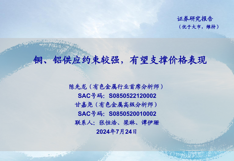 【海通证券】【20240724】有色金属行业:铜、铝供应约束较强,有望支撑价格表现-24页