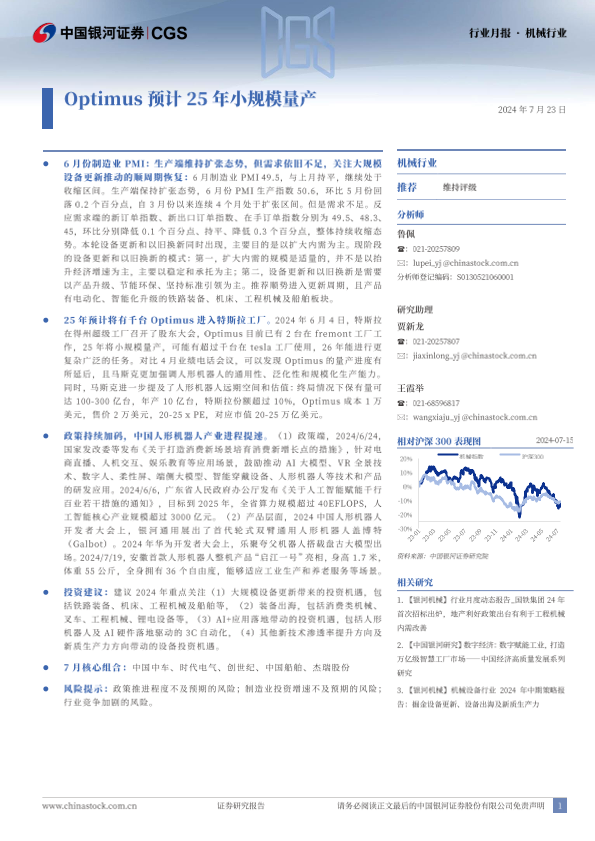 【银河证券】【20240723】机械行业月报:Optimus预计25年小规模量产-26页