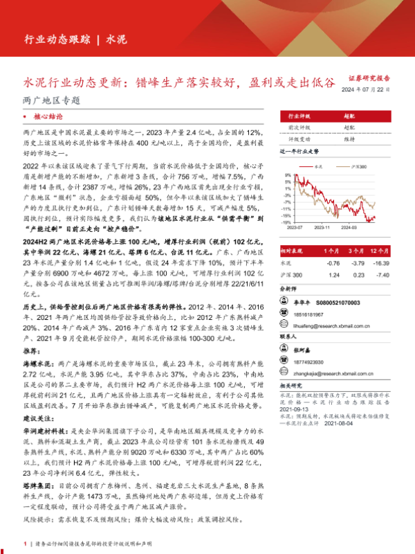 两广地区 市场分析 水泥行业 盈利预测 错峰生产