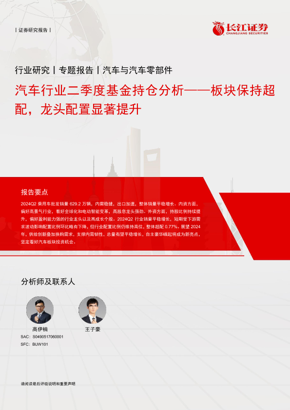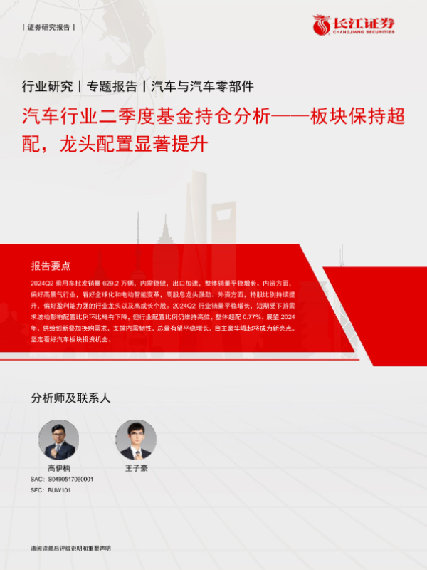 【长江证券】【20240722】汽车行业二季度基金持仓分析——板块保持超配,龙头配置显著提升-13页