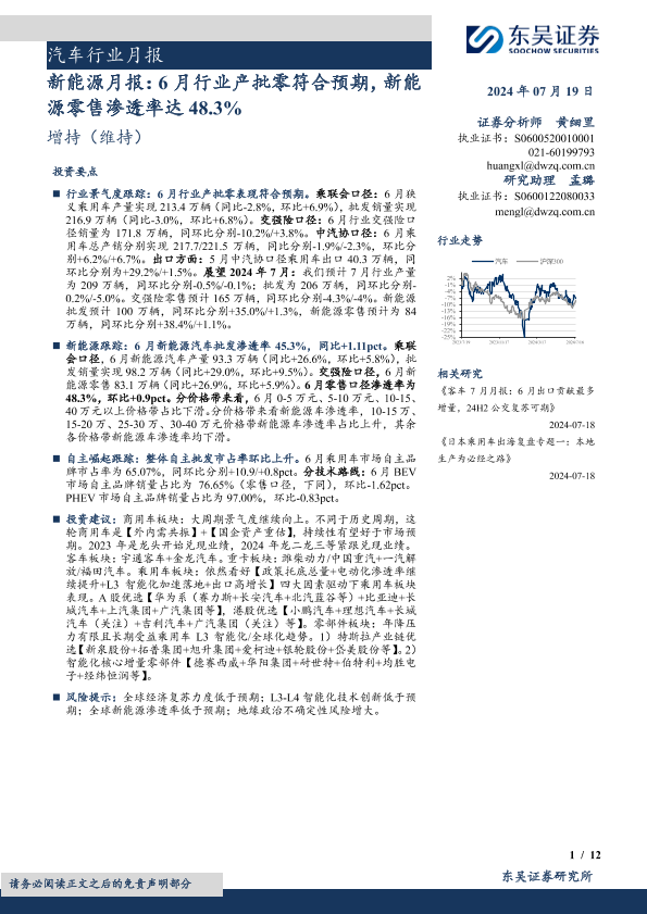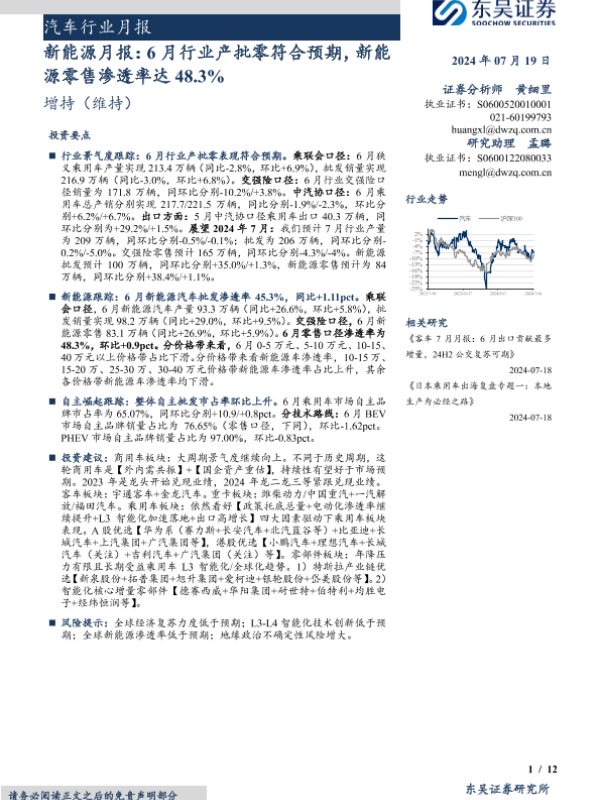 【东吴证券】【20240719】汽车行业月报-新能源月报:6月行业产批零符合预期,新能源零售渗透率达48.3%-12页