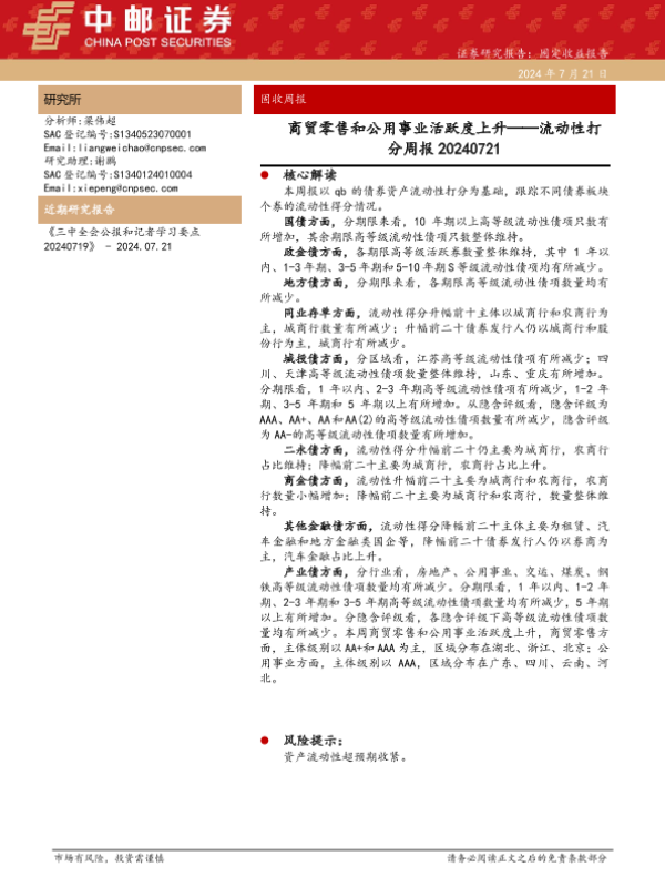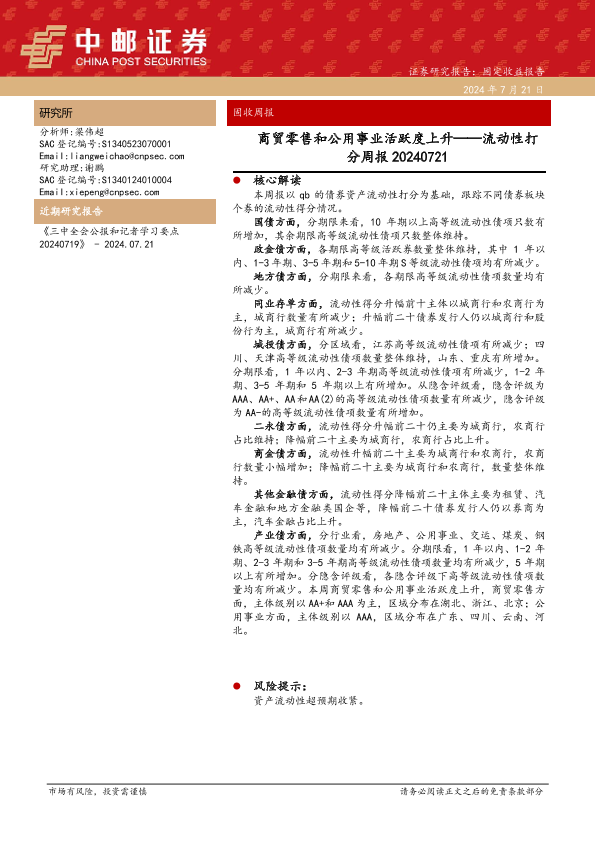 【中邮证券】【20240721】流动性打分:商贸零售和公用事业活跃度上升-37页