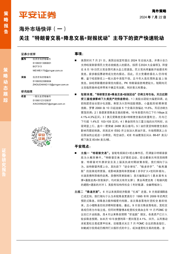 【平安证券】【20240722】海外市场快评(一):关注“特朗普交易+降息交易+财报扰动”主导下的资产快速轮动-14页