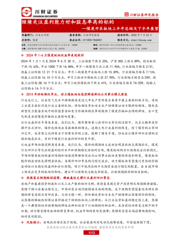【川财证券】【20240723】煤炭开采板块上半年总结及下半年展望:继续关注盈利能力好和股息率高的标的-13页