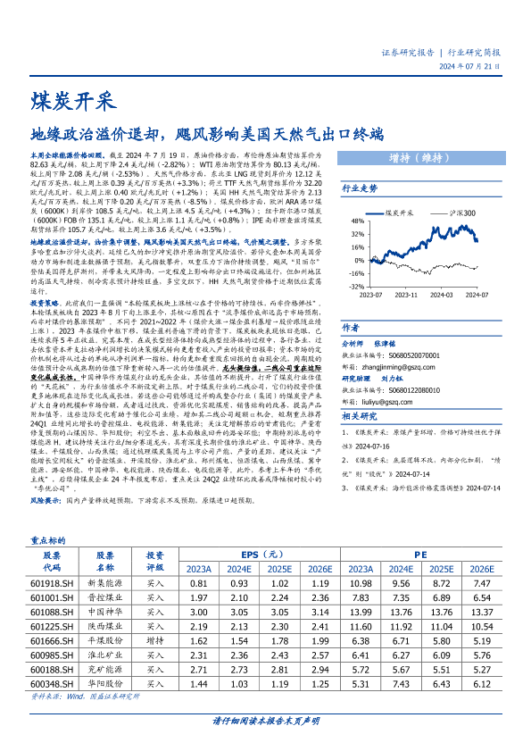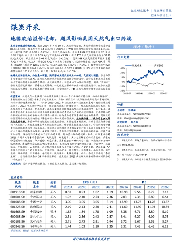 【国盛证券】【20240721】煤炭开采行业研究简报:地缘政治溢价退却,飓风影响美国天然气出口终端-12页
