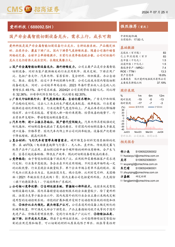 【海通证券】【20240725】爱科科技(688092)国产非金属智能切割设备龙头,需求上行,成长可期-27页